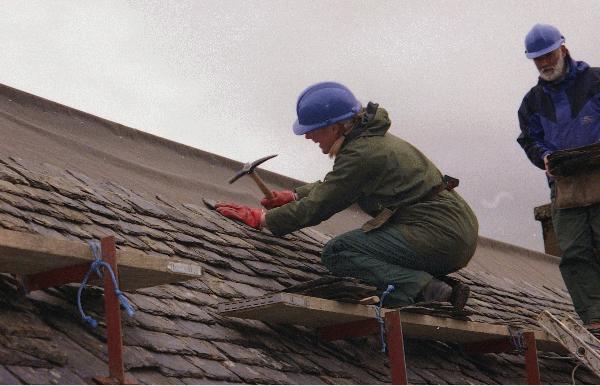 nails and this hammer and nail the slates on along the chalk line. The last